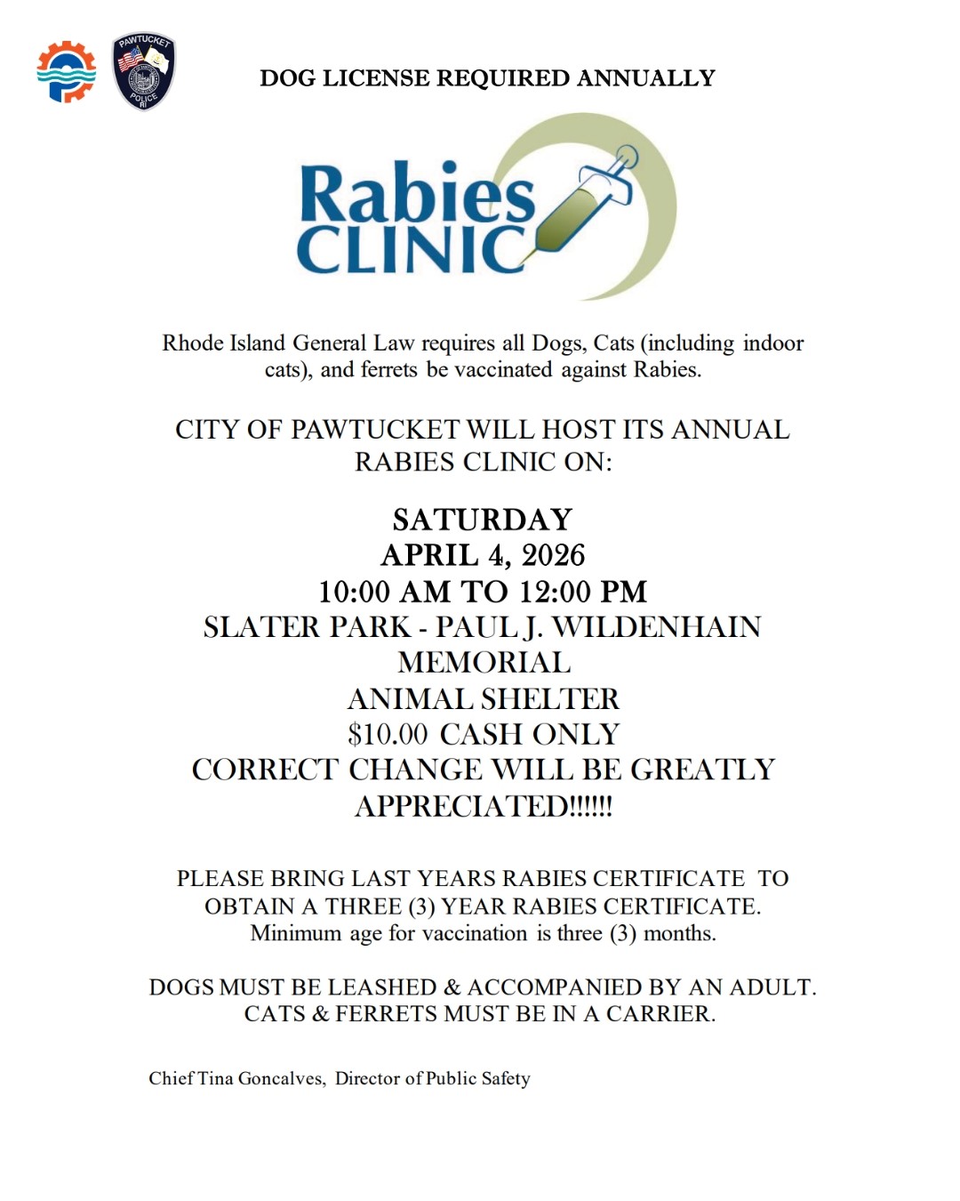Friendly Reminder for Pawtucket pet owners! The City of Pawtucket will be hosting its annual Rabies Clinic on Saturday, April 4, 2026, from 10 AM to 12 PM at Slater Park (Paul J. Wildenhain Memorial Animal Shelter). Stay compliant, keep your pets safe, and take advantage of this low-cost clinic!