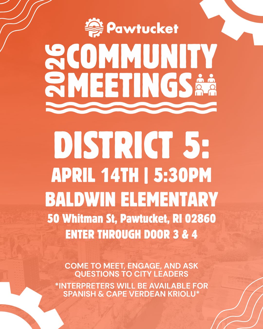 Join us Tuesday for our Community Meeting in District Five! 📍Baldwin Elementary – Door #3 & #4 📅Tuesday, April 14th 🕰️5:30PM Meet, engage with, and ask questions of city leaders. Interpreters will be available for Spanish & Cape Verdean Kriolu.