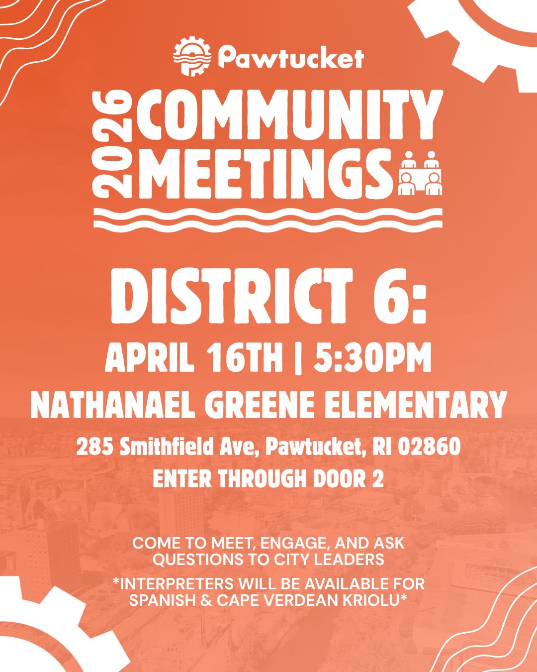 Join us Thursday for our Community Meeting in District Six! 📍Nathanael Greene Elementary – Door #2 📅Thursday, April 16th 🕰️5:30PM Meet, engage with, and ask questions of city leaders. Interpreters will be available for Spanish & Cape Verdean Kriolu.