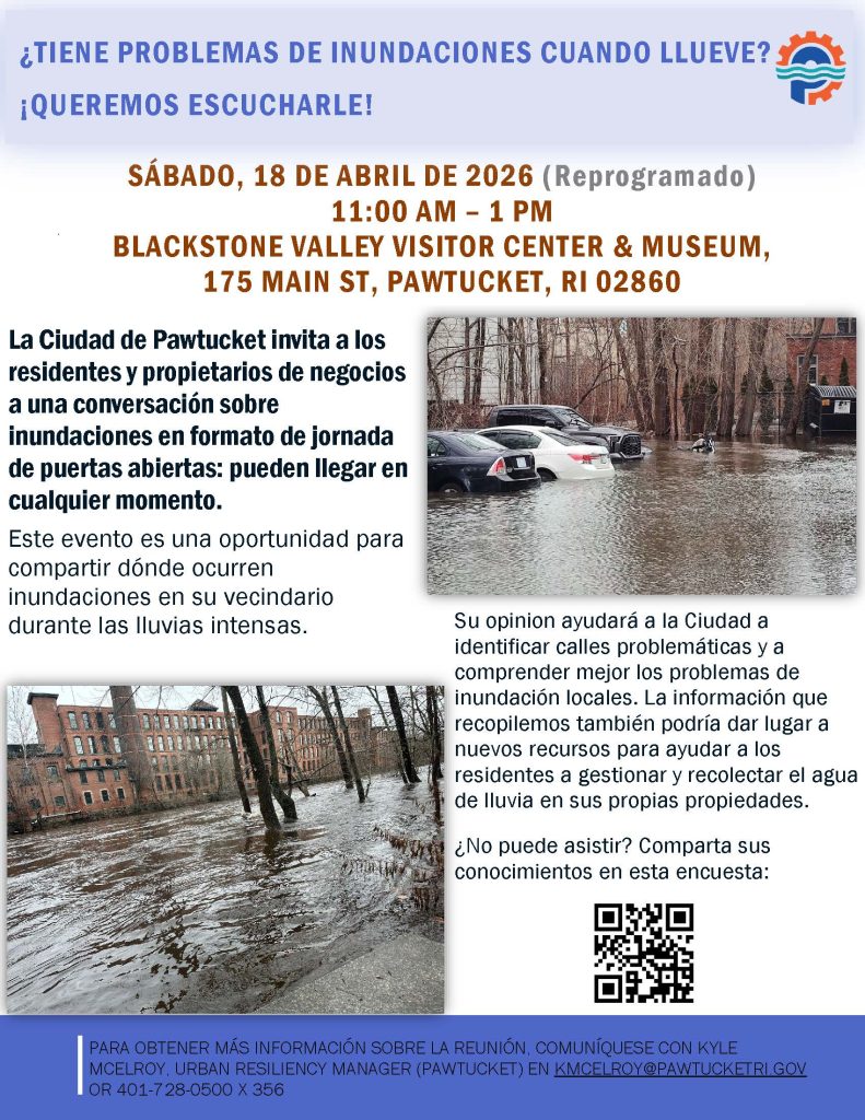 La Ciudad de Pawtucket invita a residentes y dueños de negocios a asistir a una reunión comunitaria en formato de casa abierta, reprogramada, enfocada en los problemas de inundaciones locales. El evento se llevará a cabo el sábado 18 de abril, de 11:00 AM a 1:00 PM. en el Blackstone Valley Visitor Center & Museum (175 Main Street).