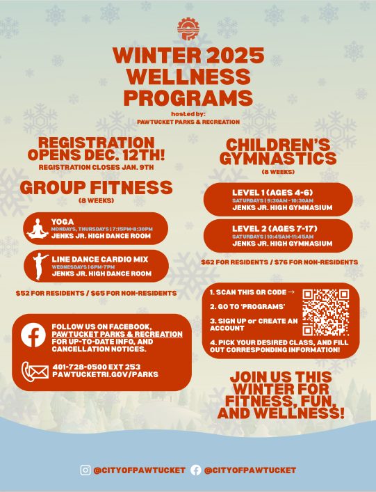 The City of Pawtucket’s Winter 2025 Wellness Programs flyer highlights a great lineup of fitness and recreation opportunities for all ages. From group fitness classes like yoga and line dance cardio mix to children’s gymnastics for ages 4–7, residents can stay active and healthy this season. Registration opens December 12th, with sessions beginning in January—perfect […]
